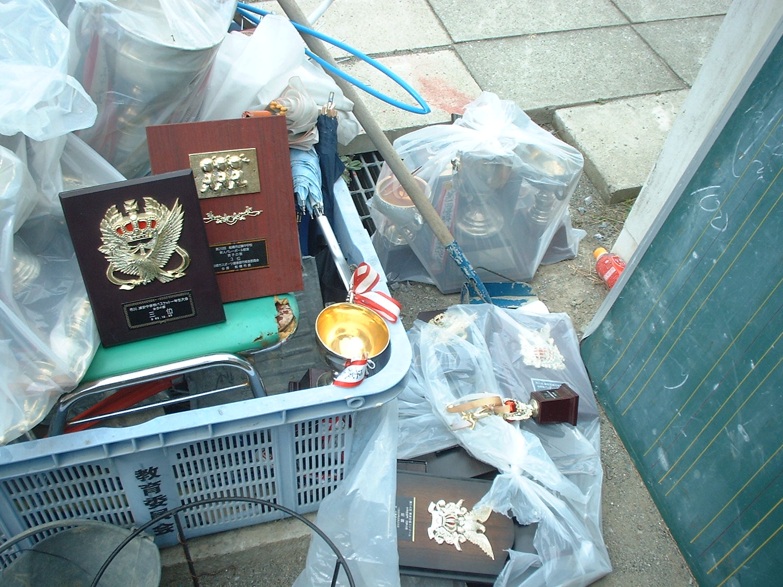 なんという残骸だ。いや、「残骸」って言わないか。これ撮るために、1回家に帰る僕。「あんたバカじゃないの?」っていわれたら言い返せません。しかし、こいつは酷い。たては、かさばるから捨てるのは100歩ゆずって許そう。しかし、カップが捨ててあるのはなんだ!?これは、年々優勝するところに受け継がれていくものでしょう!?捨てちゃっていいの??なんと、最近の物まであるではないか。なんということだ・・。